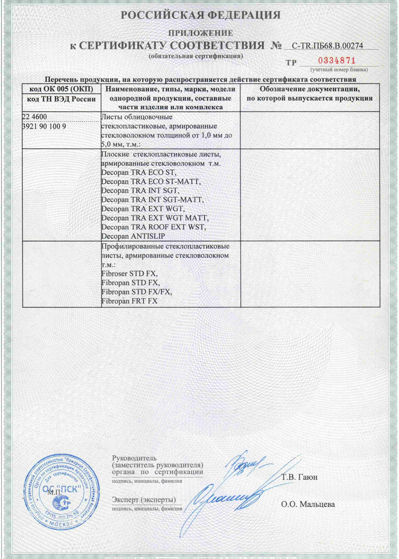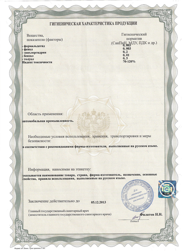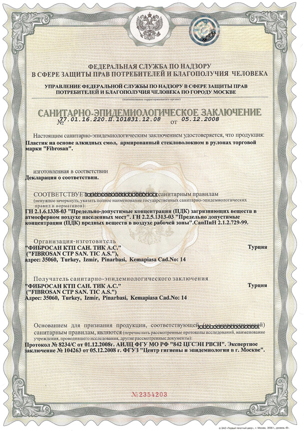 Пожарный сертификат Fibrosan Пожарный сертификат Fibrosan Гигиенический сертификат Гигиенический сертификат (сторона 2)